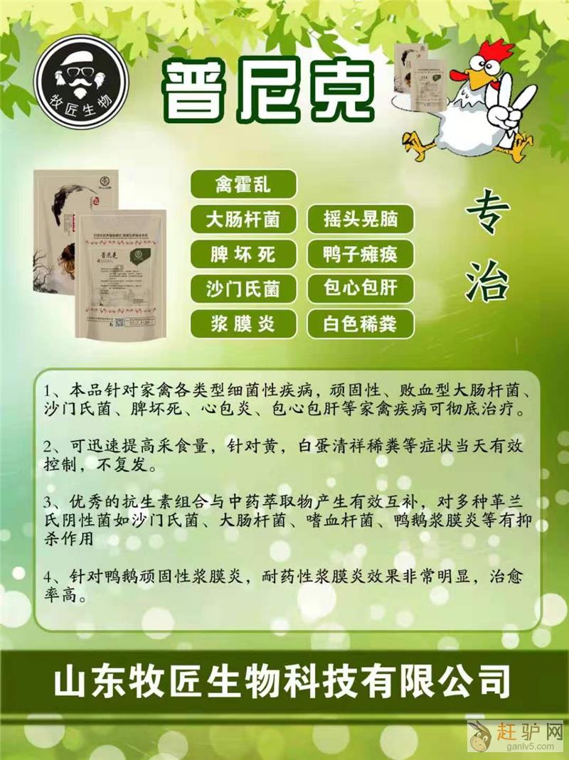 3.针对鸭浆膜炎造成的包心包肝,瘫痪,一瘸一拐,脾坏死等效果显著。后期不易产生耐药性赶驴网。